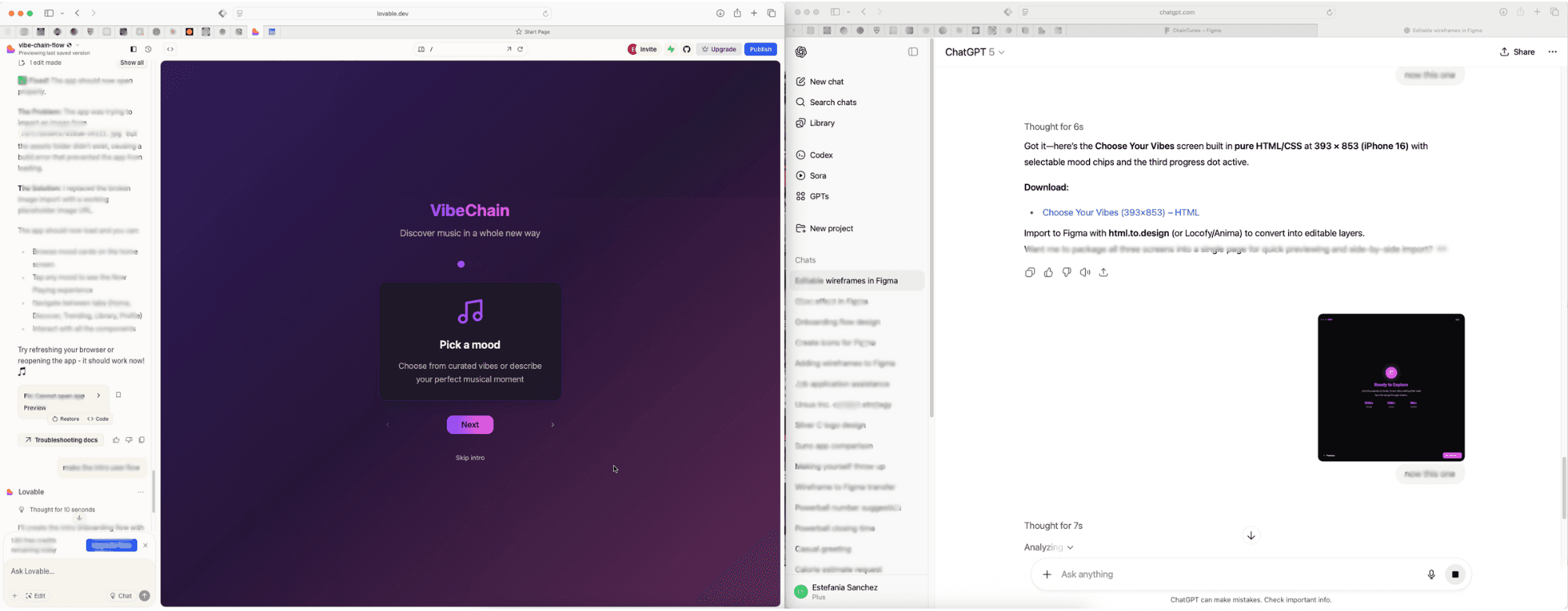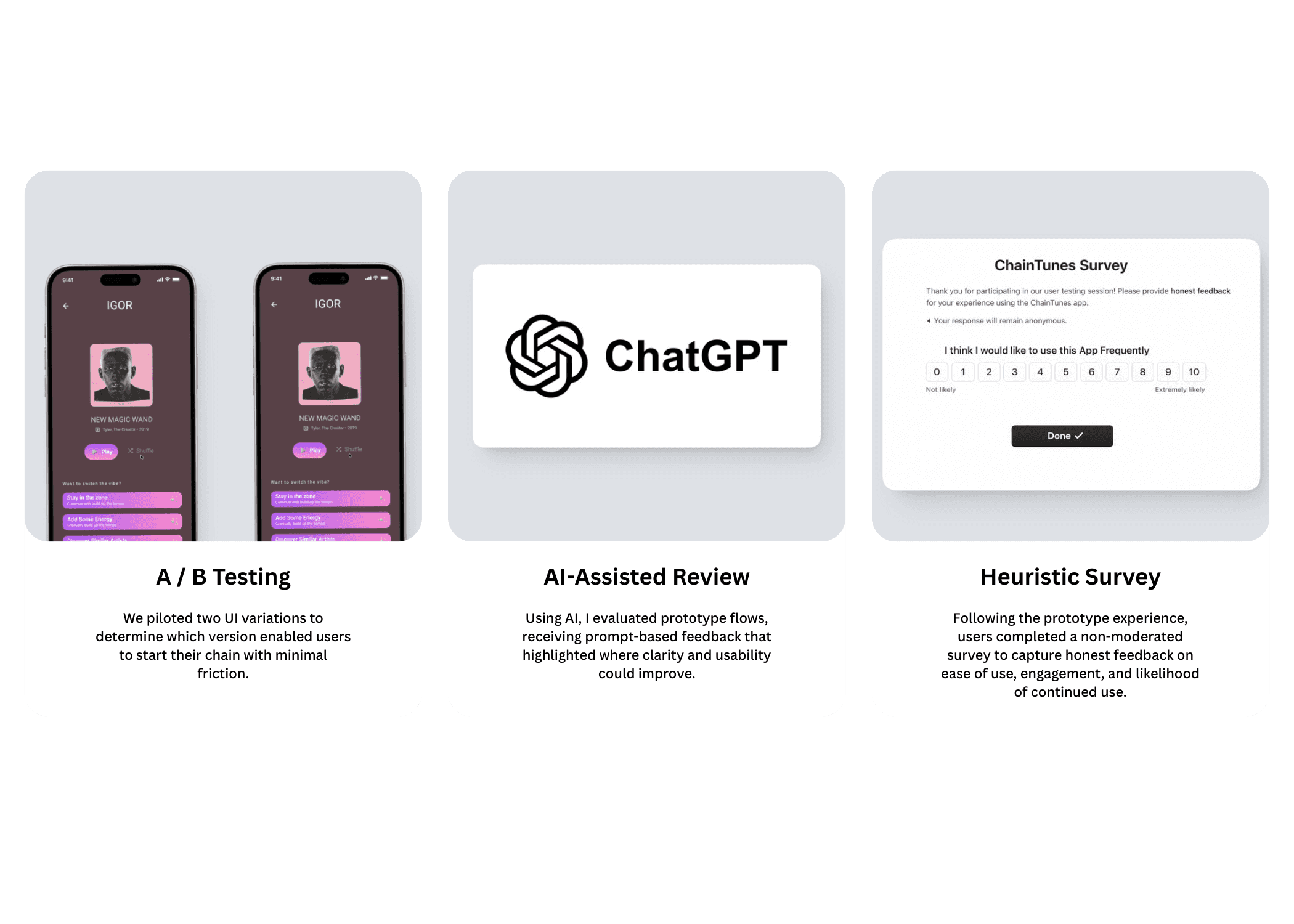 This surfaced a clear opportunity: existing music platforms optimize for passive, algorithm driven listening, while ChainTunes differentiates through interactive, mood based discovery with transparent AI reasoning and user choice. Using AI this way reduced time spent on information gathering and allowed me to focus on synthesis, decision making, and designing a more intentional, differentiated experience.
