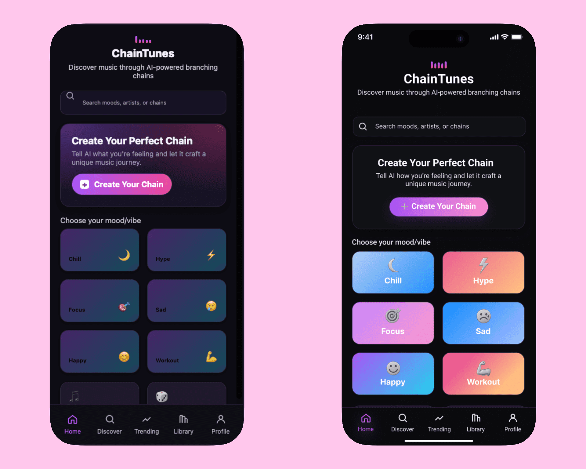 I refined the Home screen to strengthen hierarchy and reduce visual noise. By increasing contrast, simplifying backgrounds, and clearly elevating the primary CTA, users can immediately understand where to start. The updated mood tiles are more distinct and scannable, improving discoverability and making Home a clearer entry point into the Chain creation flow.