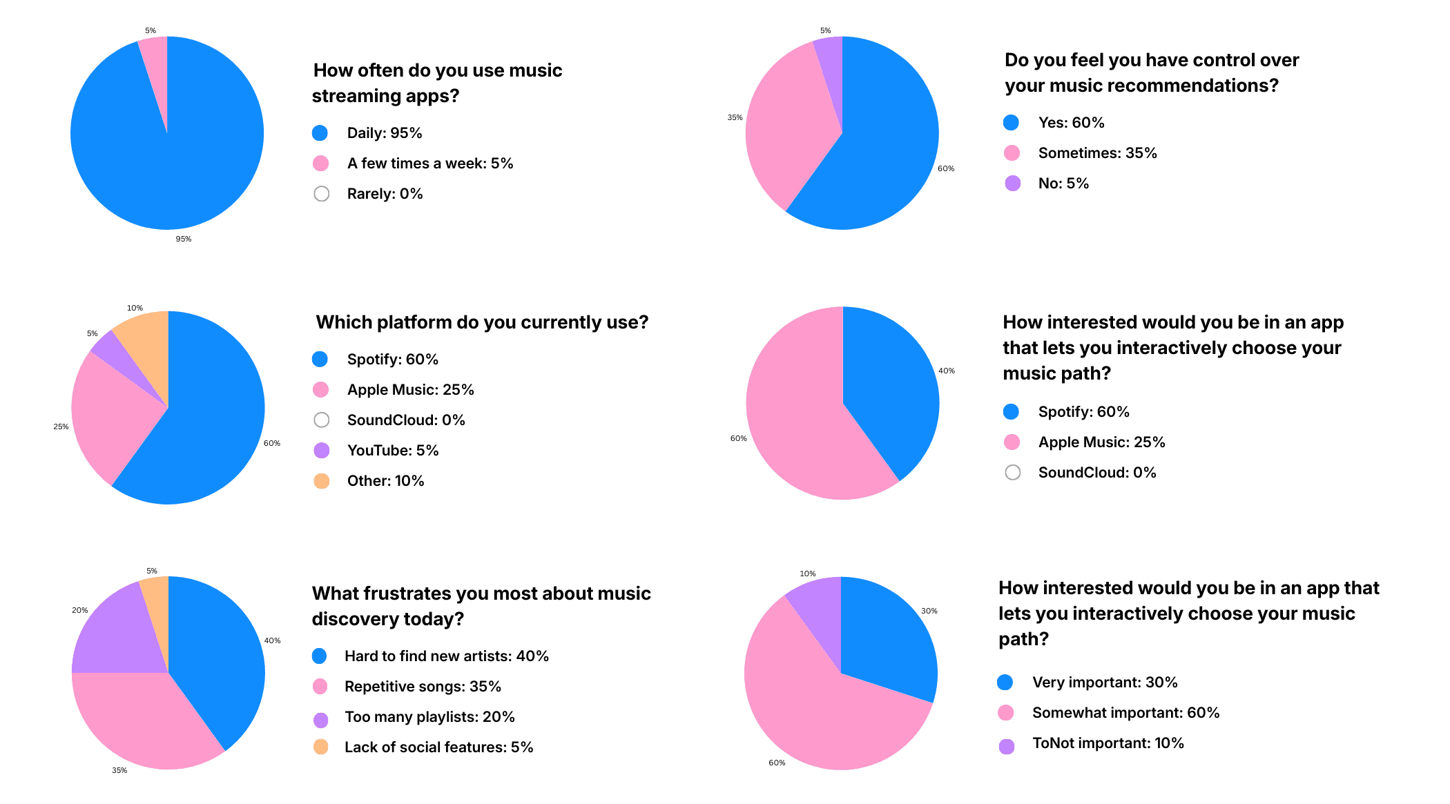 I surveyed 20 participants aged 20–30 to understand current discovery habits and frustrations. Key themes included repetitive recommendations and difficulty finding new artists. While some felt partial control, all participants expressed interest in actively shaping their music path, reinforcing the need for a more interactive and transparent discovery experience.