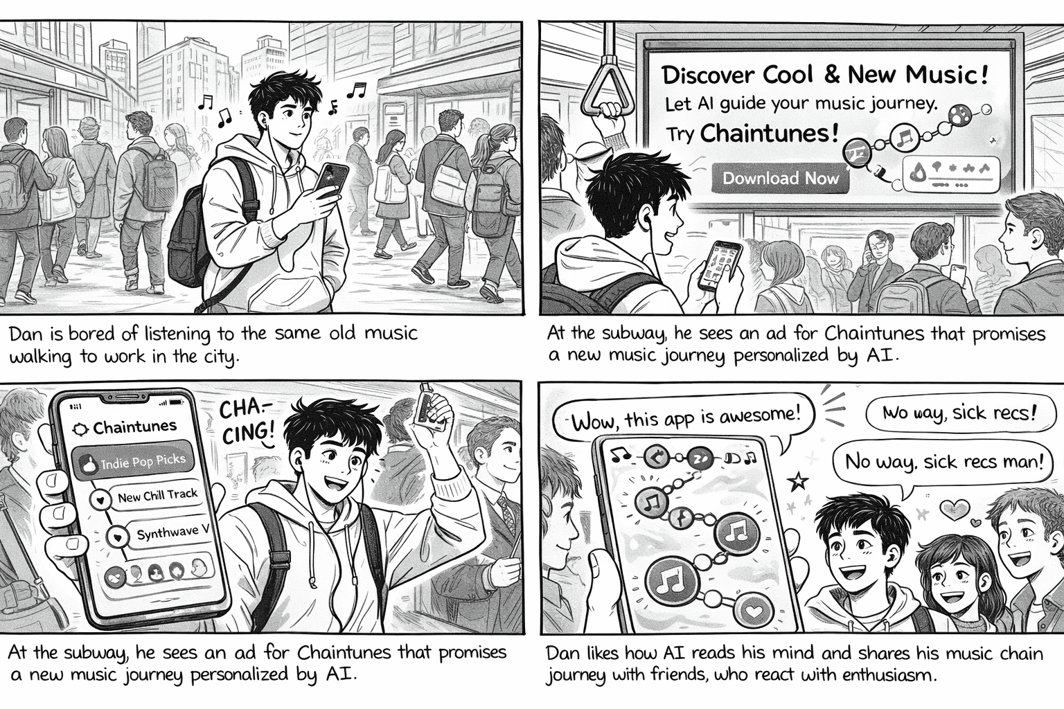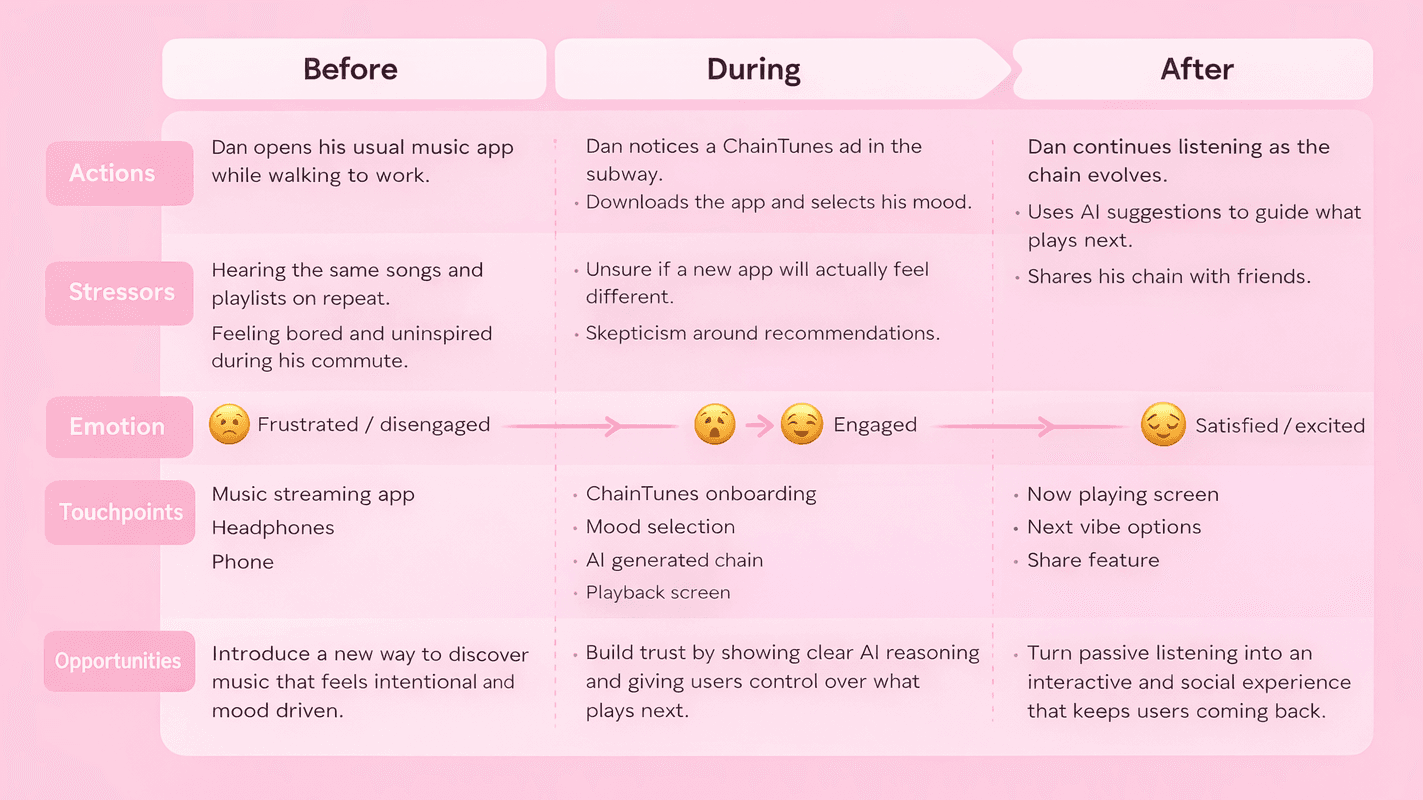 This storyboard illustrates a real-life use case for ChainTunes, showing how AI-powered chains solve the frustration of repetitive listening. It helps communicate the product’s value quickly by grounding the experience in a relatable moment and demonstrating how AI guidance and sharing turn passive listening into an intentional, social journey.