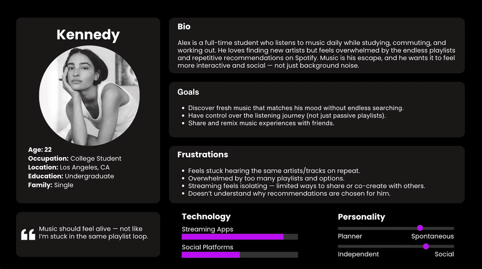 This persona, Kennedy, represents our core user: a spontaneous college student who feels stuck in repetitive playlists and overwhelmed by options. Kennedy’s desire for interactive discovery, control over their music journey, and social sharing shaped our design decisions toward mood-based exploration and branching paths.