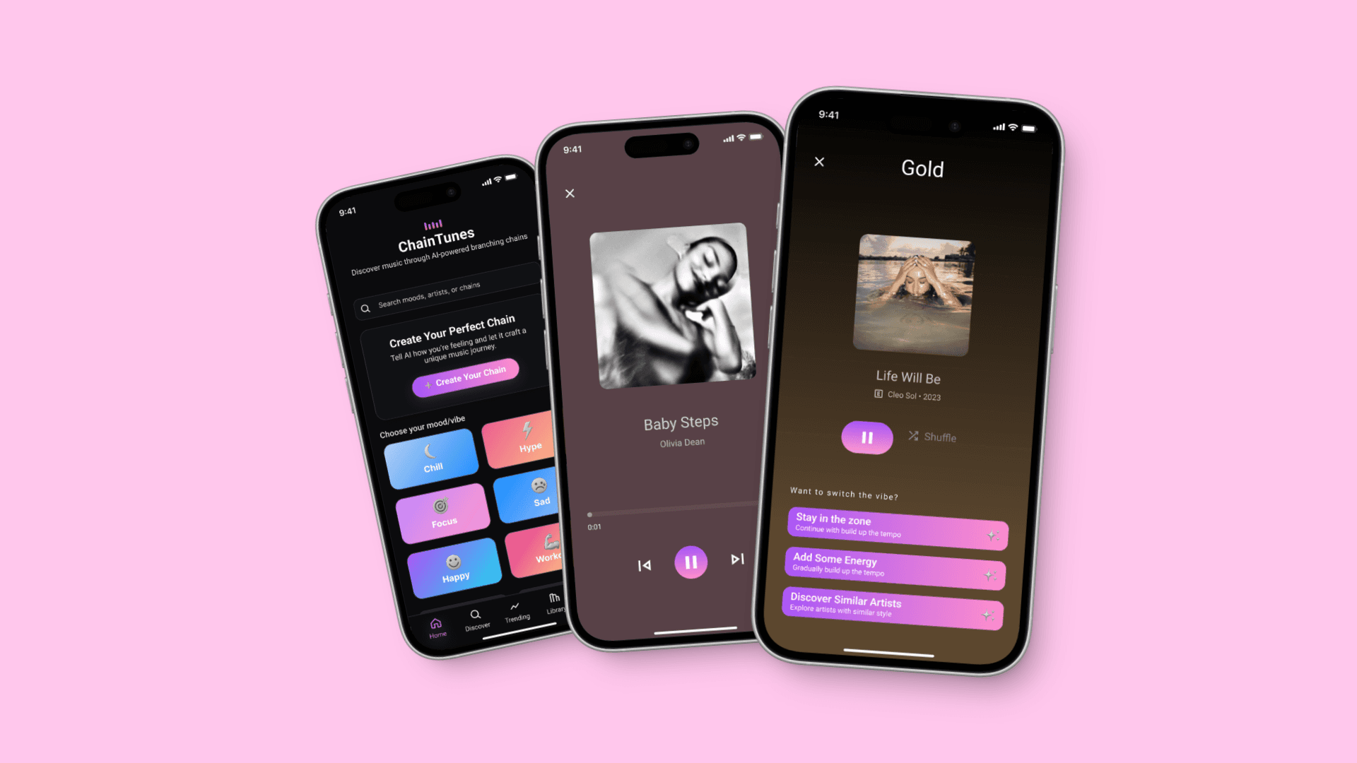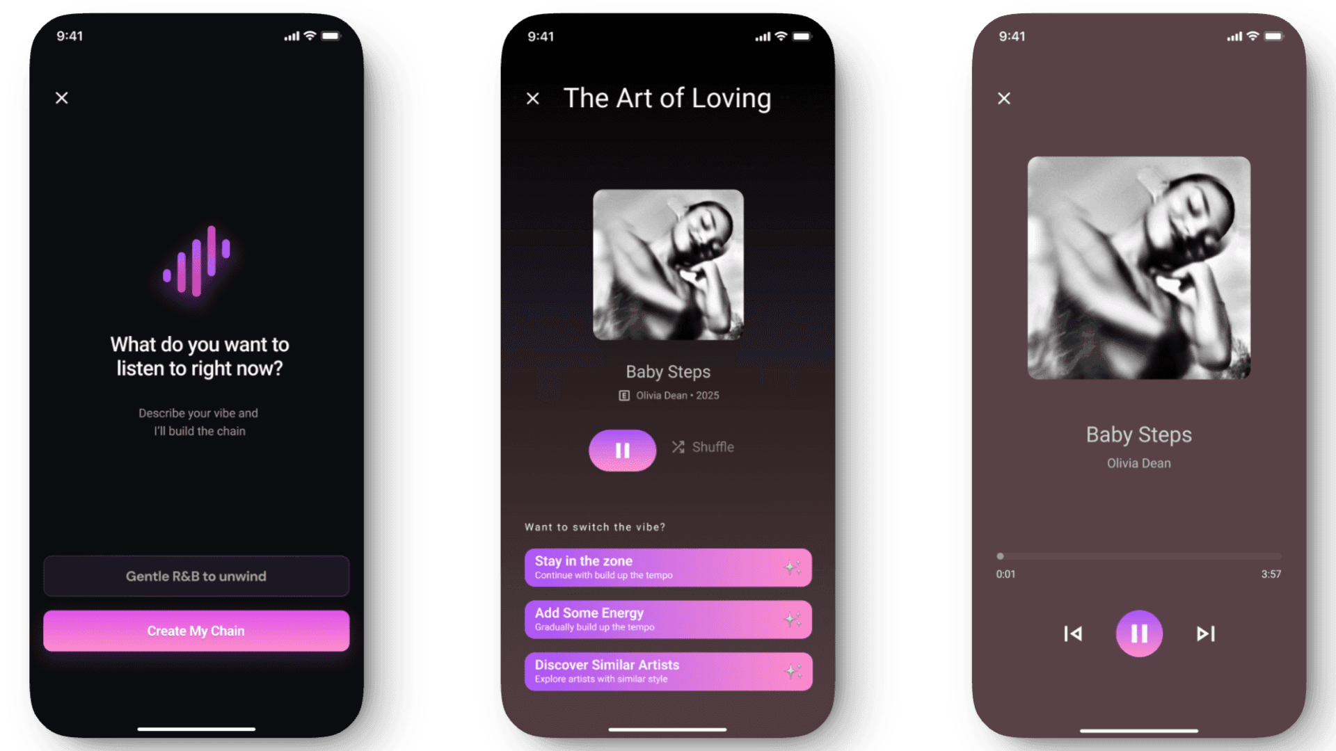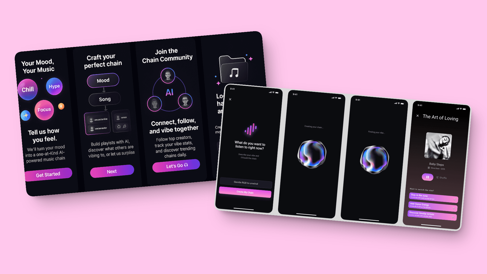 This was a major product decision. Instead of asking users to actively build a chain step by step, I shifted the experience to let AI handle chain creation by default. This reduced cognitive load and friction at the moment of intent, allowing users to move seamlessly from expressing a mood to listening. The UI reframes creation as guidance rather than configuration, making the experience faster, more approachable, and better aligned with how users naturally discover music.