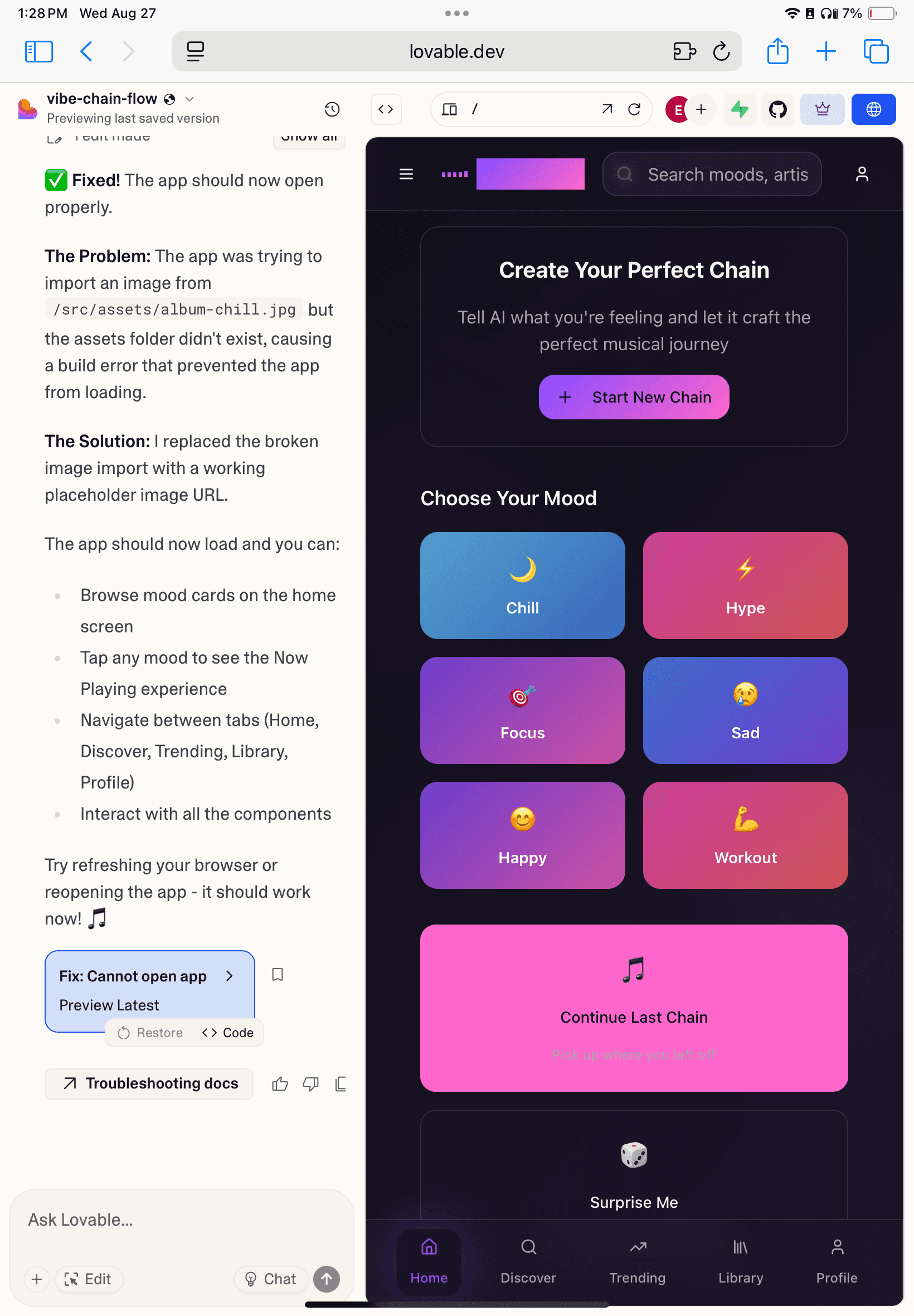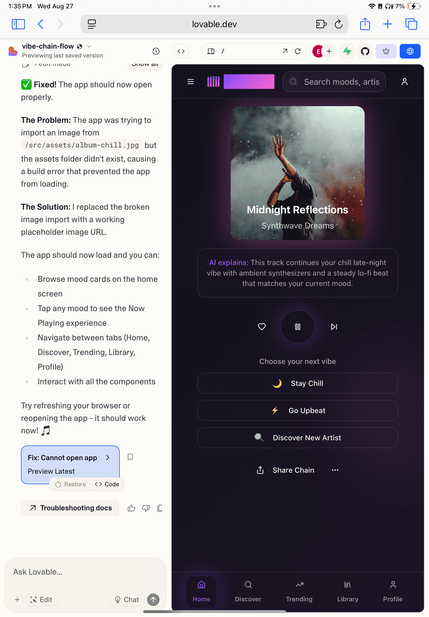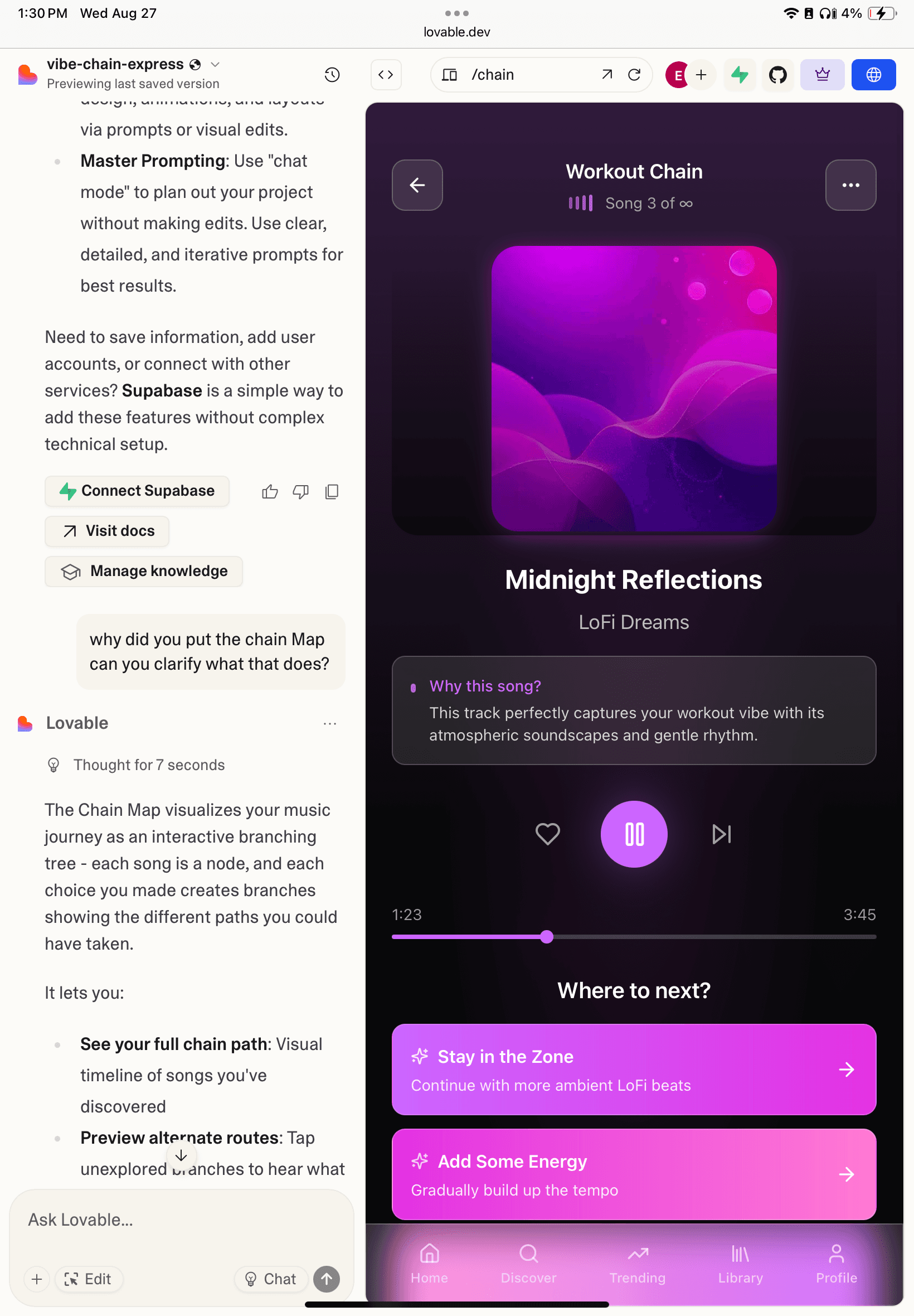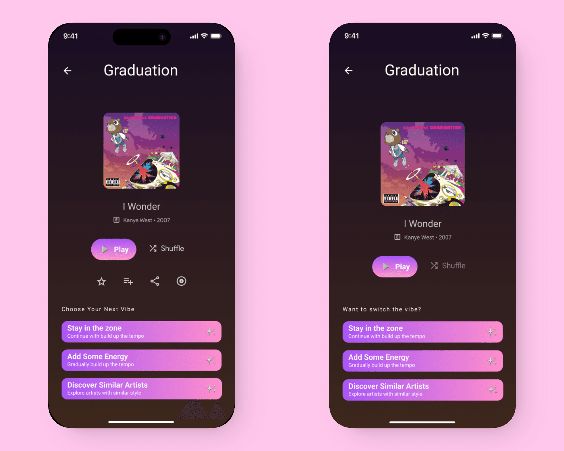 This was a major product decision. Instead of asking users to actively build a chain step by step, I shifted the experience to let AI handle chain creation by default. This reduced cognitive load and friction at the moment of intent, allowing users to move seamlessly from expressing a mood to listening. The UI reframes creation as guidance rather than configuration, making the experience faster, more approachable, and better aligned with how users naturally discover music.