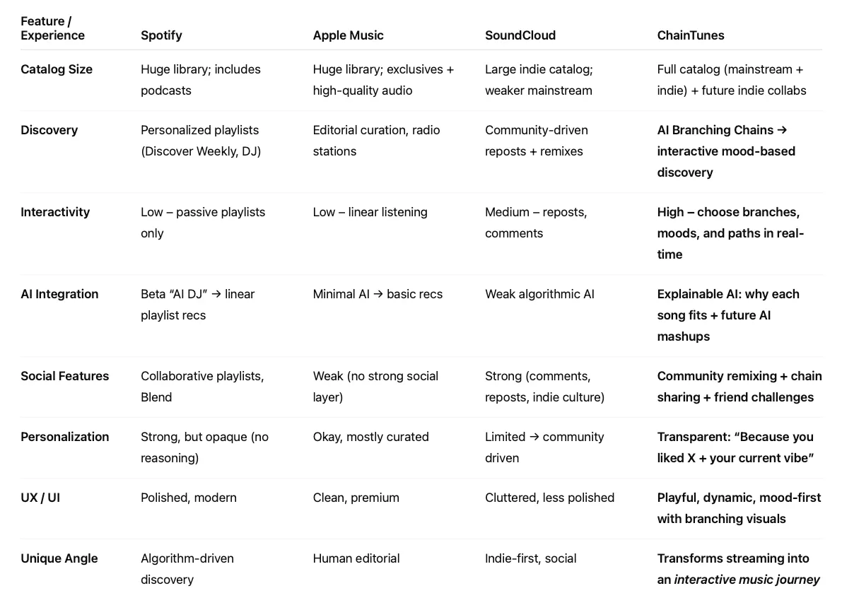 To move quickly without losing rigor, I used AI as a research accelerator to map the competitive landscape across discovery, interactivity, and personalization. By grounding prompts in ChainTunes’ product vision and target user context, I was able to rapidly compare leading platforms and identify meaningful patterns.