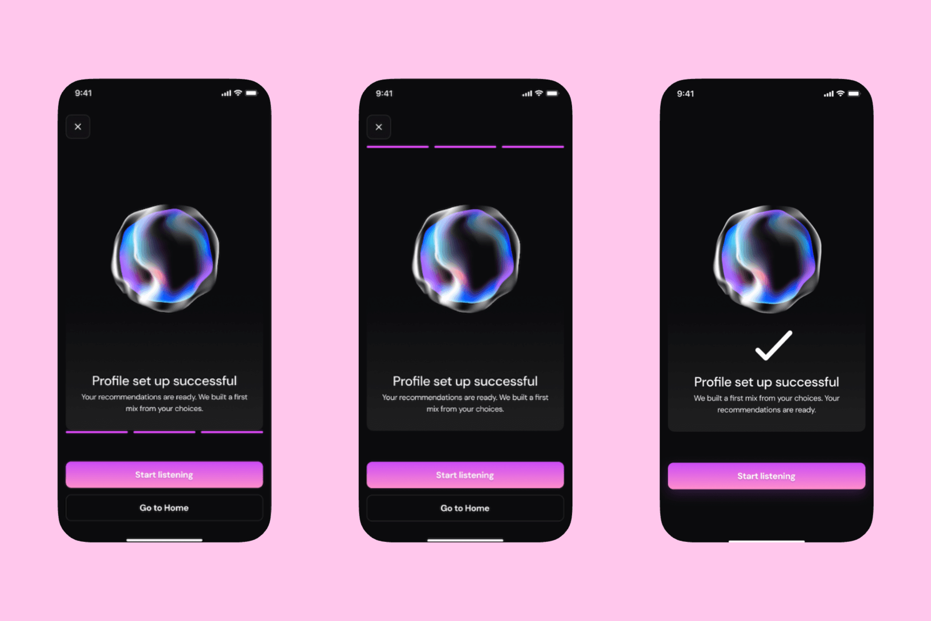 I iterated on multiple completion screen variants to ensure the end of onboarding felt clear and final. Earlier versions introduced secondary actions and progress indicators, which created uncertainty about whether setup was complete. The final design intentionally removes unnecessary exits and visual cues, focusing on a single success state and primary action. This makes completion unambiguous, reduces hesitation, and transitions users directly into the Home experience with confidence.