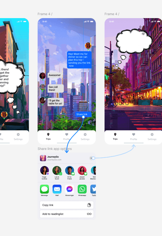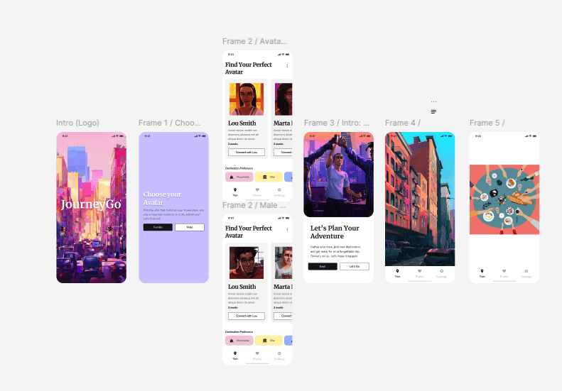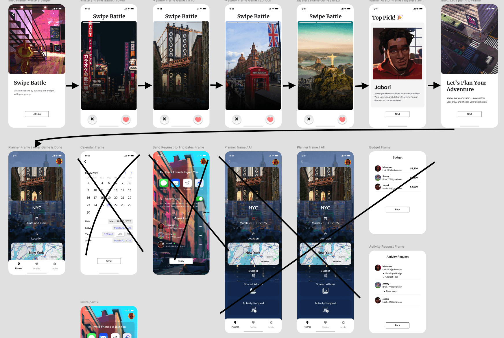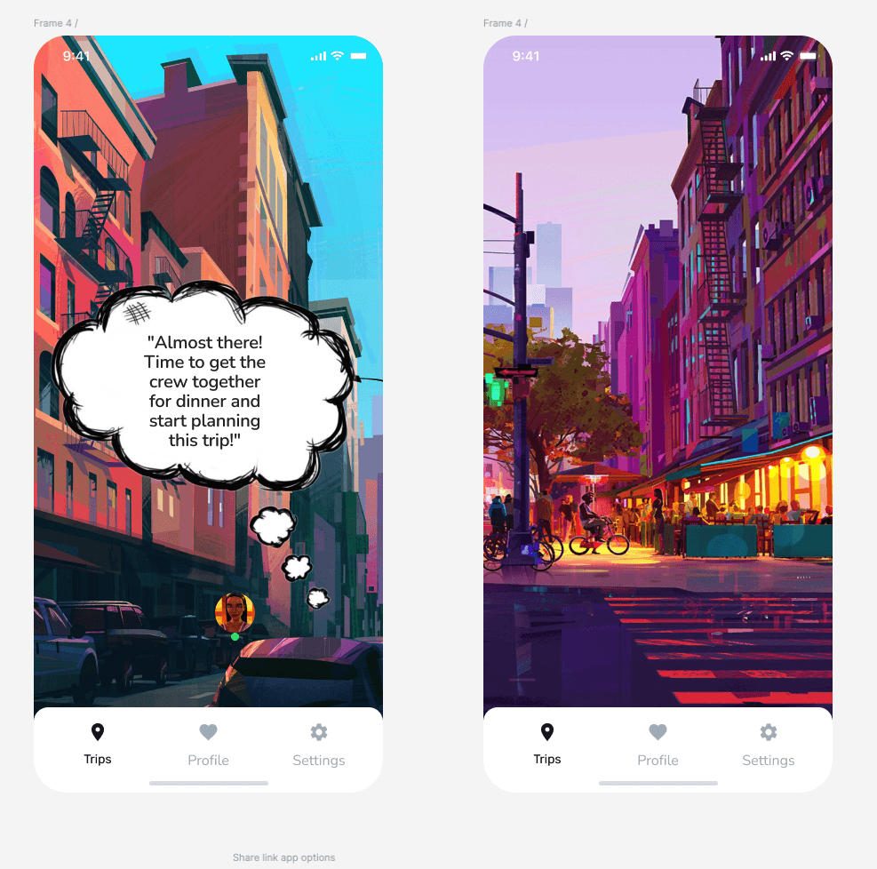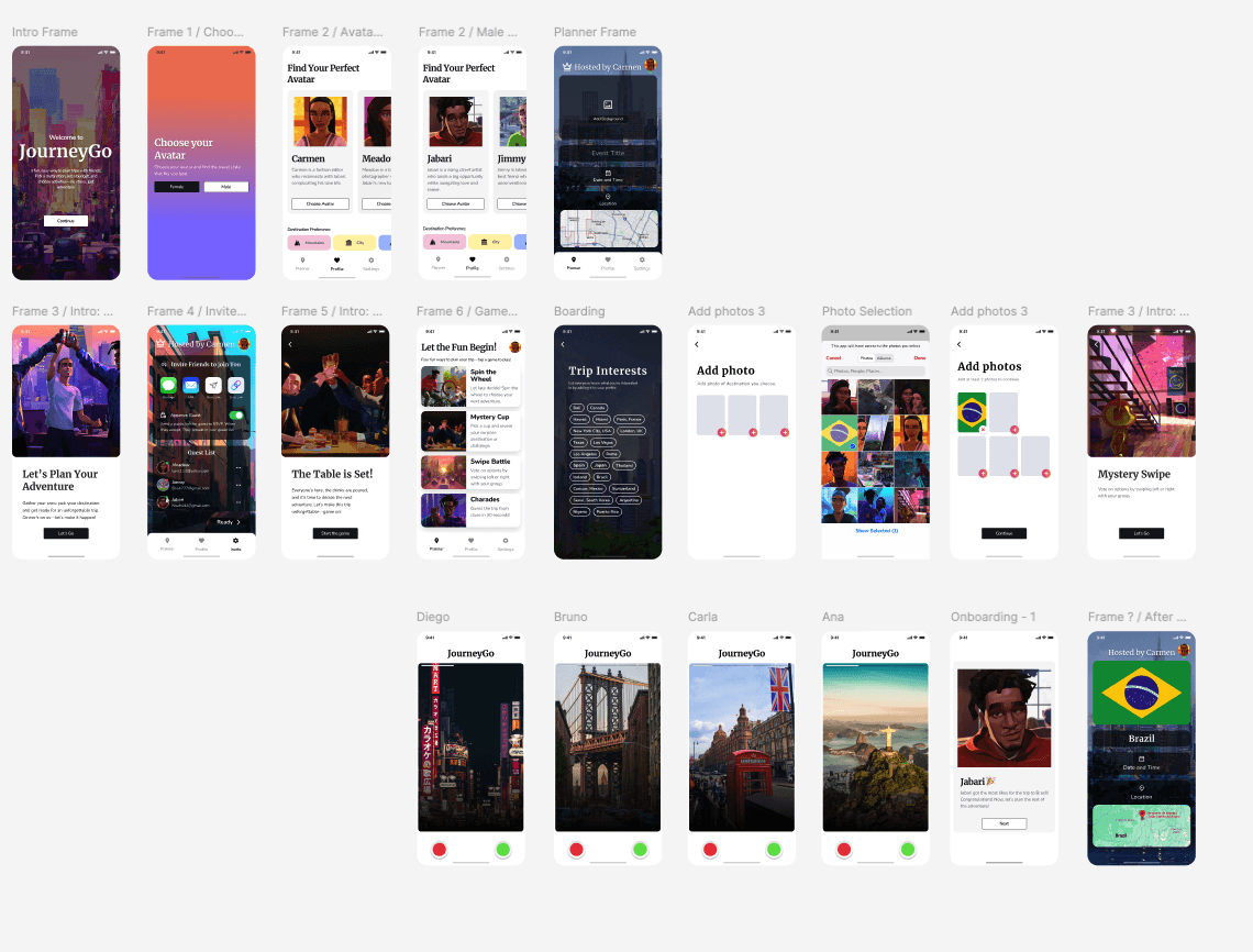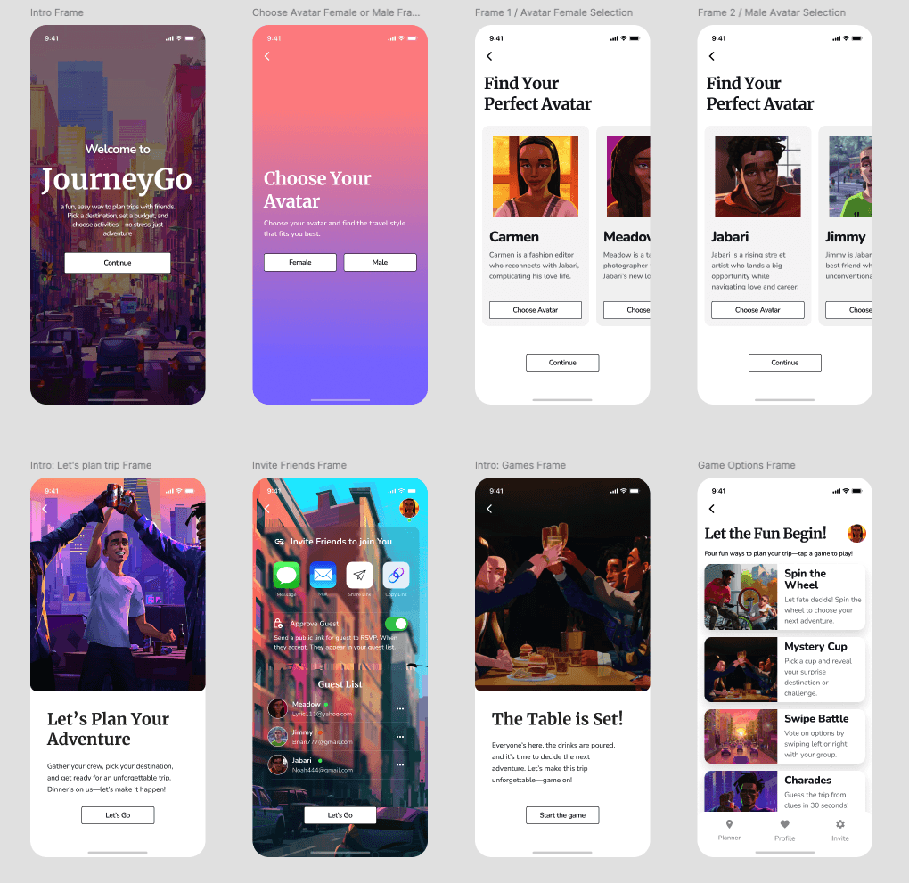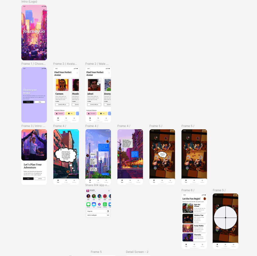 The main goal during the design process was to create a seamless and playful experience for users planning group trips. As the project evolved, I made several refinements to improve layout efficiency and enhance key interactions—especially around gamified decision-making and the planning flow.