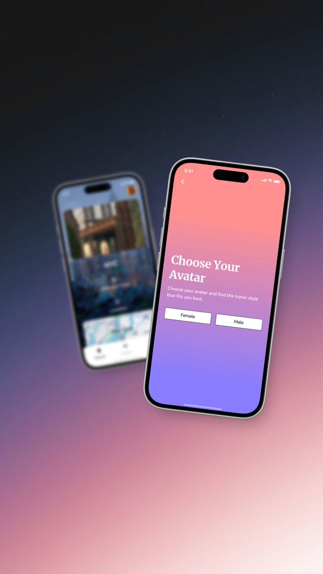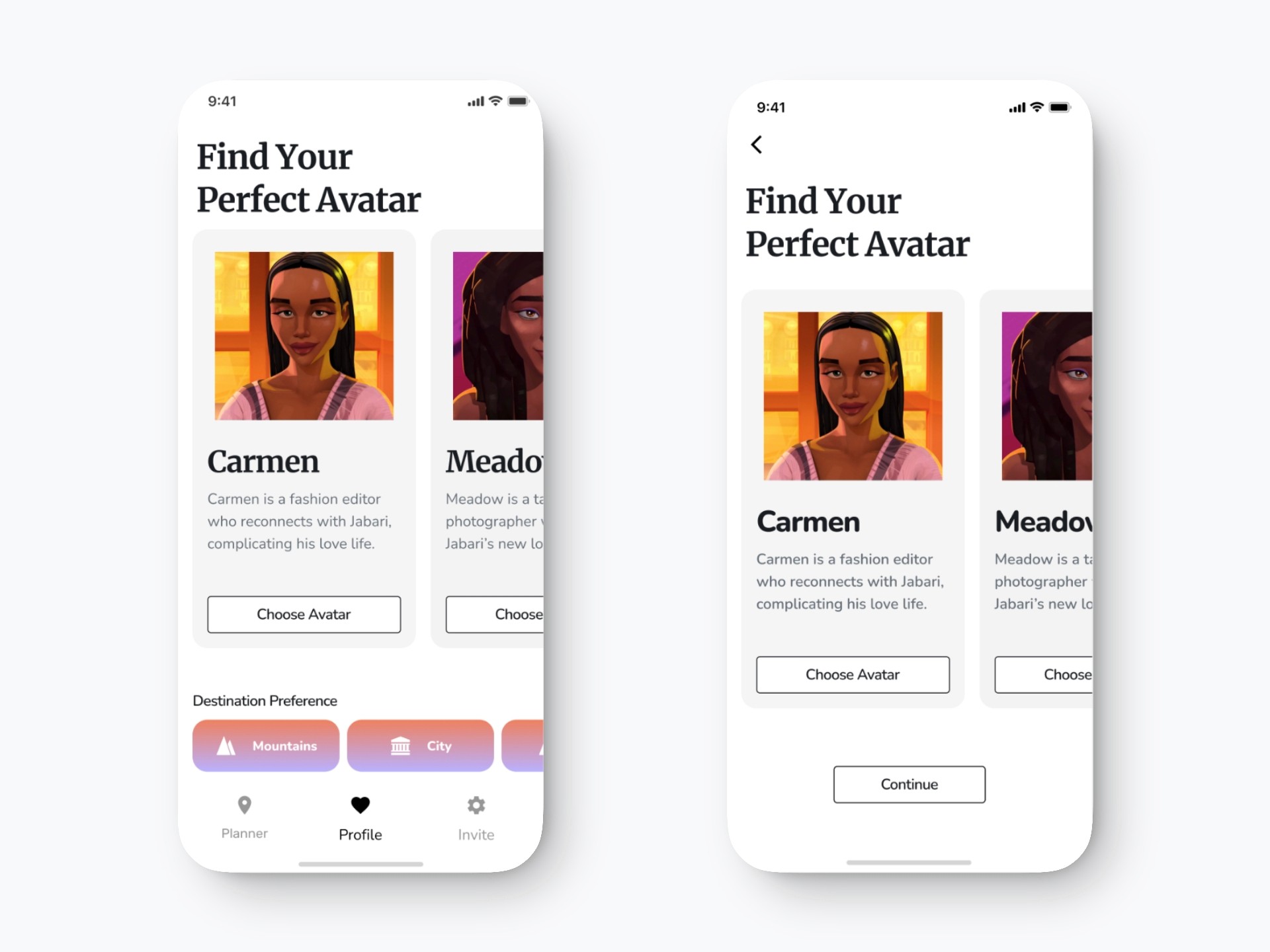 I added a back button for clear navigation and removed the destination preference bar and bottom nav to keep the user focused on avatar selection. The “Continue” button was added to guide users to the next step, and the avatar cards were centered to reduce empty space and improve layout balance.