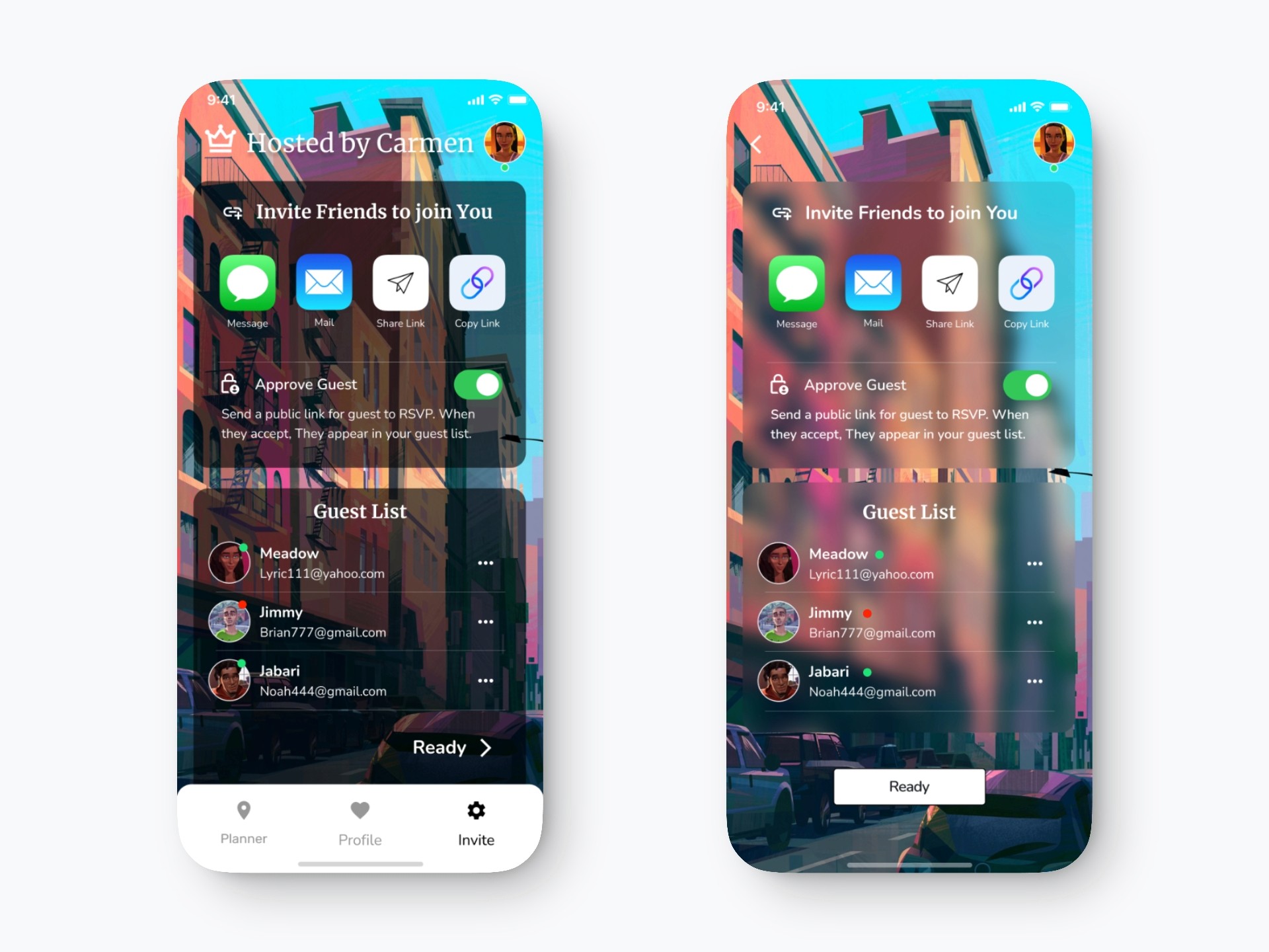 I added a back button for smoother navigation and removed the bottom navigation to reduce distractions. The status indicators (green/red dots) were moved next to each name for better clarity and alignment with user expectations. I also introduced a blur background effect to create visual depth and elevate the overall aesthetic. Finally, a “Ready” button was added to clearly signal the next step and improve task flow.
