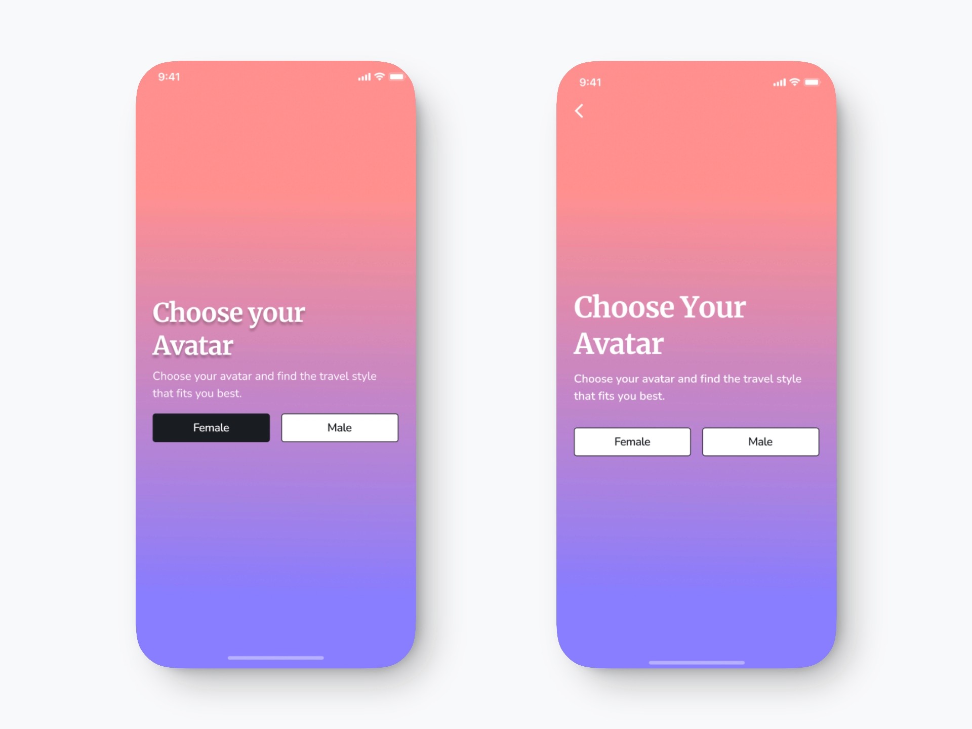 To improve navigation and usability, I added a back button to the top left corner, aligning with standard mobile design patterns. I removed the shadow from the title for a cleaner and more modern visual hierarchy, increased the font size for better readability, and added spacing between the headline and supporting text to enhance accessibility and content scannability. Additionally, I unified the design of the “Female” and “Male” buttons to reduce cognitive load and prevent selection bias, ensuring a more balanced and inclusive user experience.