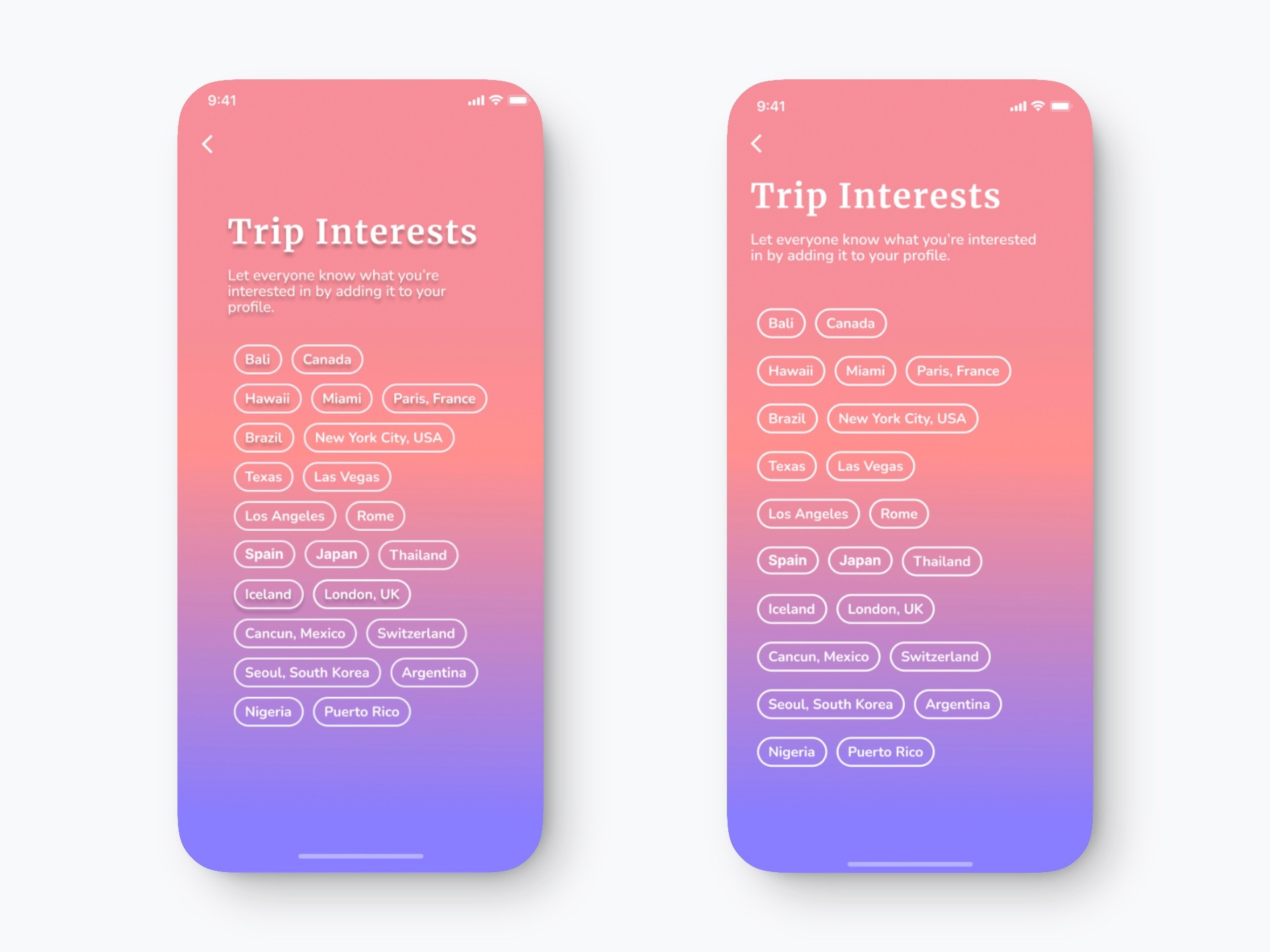 I also increased vertical spacing between the interest tags to reduce visual clutter and improve tap target accessibility, making it easier for users to scan and interact with the options. These adjustments enhance readability, accessibility, and design consistency throughout the flow.